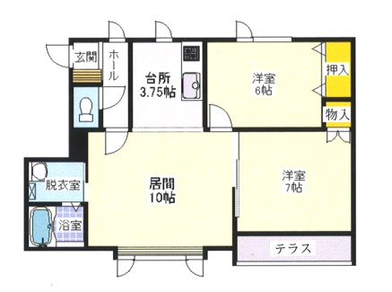 | 間取 | 居間10帖・台所3.75帖・洋室6帖(押入)・洋室7帖(物入)・浴室(UB)・脱衣室・トイレ・テラス | ||